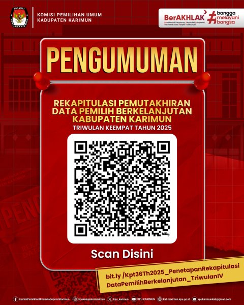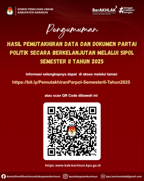 KPU Kabupaten Karimun menyampaikan hasil pemutakhiran data dan dokumen Partai Politik secara berkelanjutan melalui Sistem Informasi Partai Politik (SIPOL) pada Semester II Tahun 2025. Pemutakhiran data ini dilaksanakan sebagai bagian dari upaya KPU dalam menjaga akurasi, validitas, dan keterbaruan data kepartaian guna mendukung penyelenggaraan pemilu yang transparan, akuntabel, dan berintegritas. Dalam pelaksanaannya, KPU Kabupaten Karimun melakukan fasilitasi dan pendampingan kepada Partai Politik dalam melakukan pembaruan data dan dokumen melalui SIPOL sesuai dengan ketentuan peraturan perundang-undangan yang berlaku. Informasi lengkap mengenai hasil pemutakhiran data dan dokumen Partai Politik Semester II Tahun 2025 dapat diakses melalui tautan berikut: https://bit.ly/PemutakhiranParpol-SemesterII-Tahun2025 atau dengan memindai QR Code yang tersedia. ....