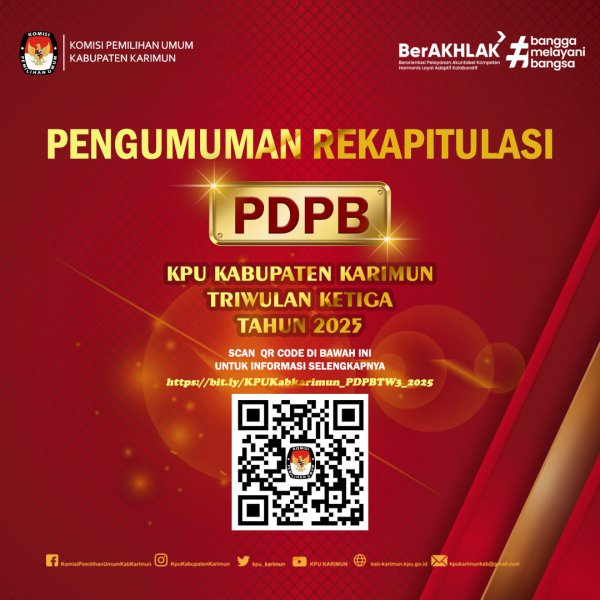 Berikut adalah Link Pengumuman Rekapitulasi Pemutakhiran Data Pemilih Berkelanjutan (PDPB) Kabupaten Karimun Provinsi Kepulauan Riau Triwulan Ketiga Tahun 2025. Scan barcode di atas atau dapat langsung mengunjungi web portal Cek di Sini #KPUMelayani ....