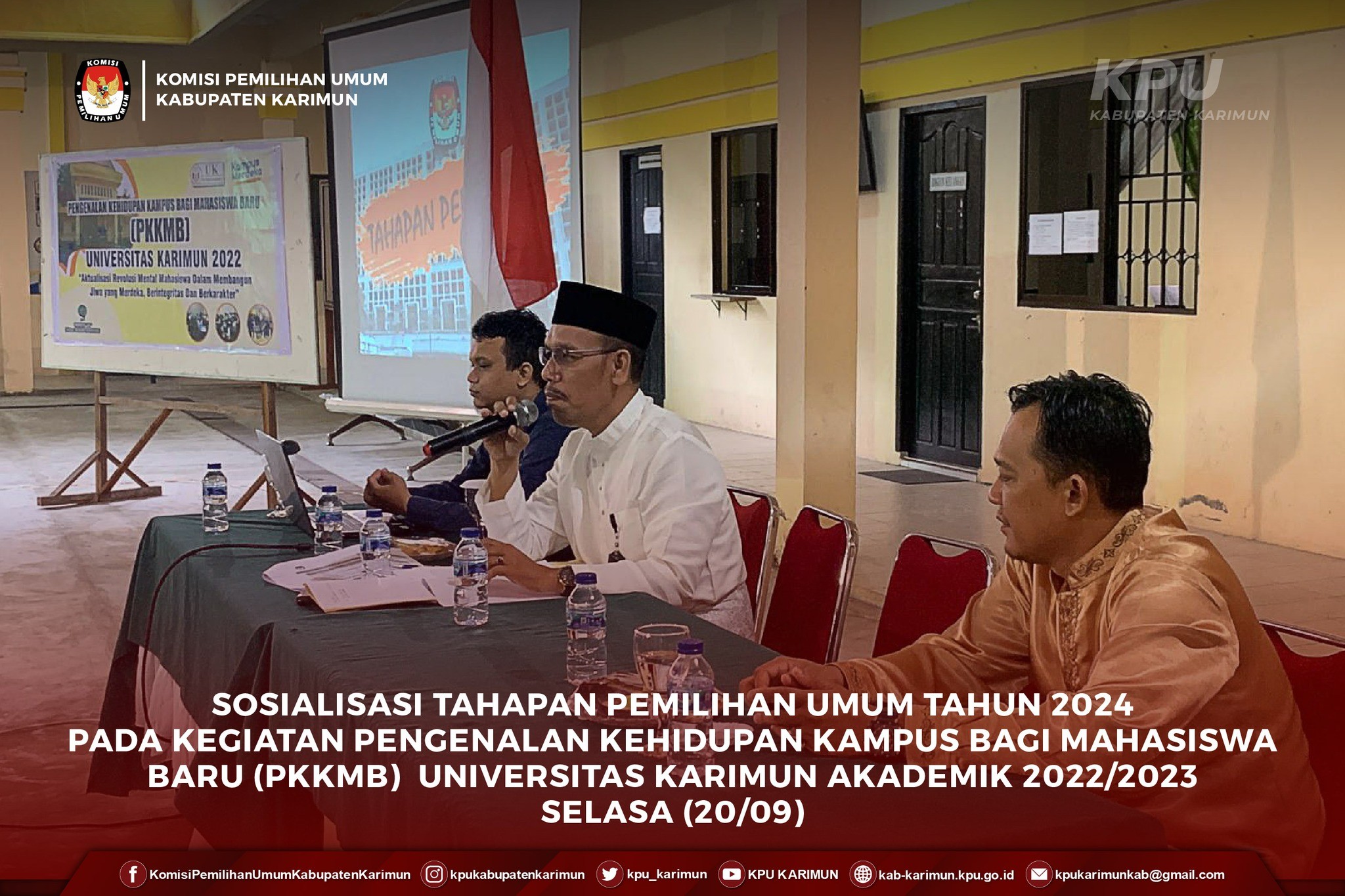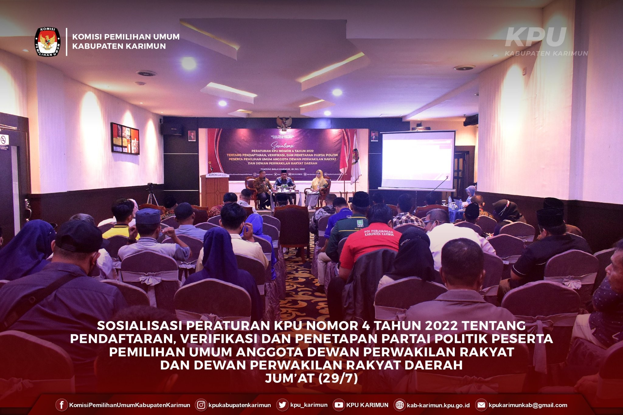 KPU KABUPATEN KARIMUN.Jumat (29/07) KPU Kabupaten Karimun melaksanakan Sosialisasi Peraturan Komisi Pemilihan Umum Nomor 4 Tahun 2022 tentang Pendaftaran, Verifikasi dan Penetapan Partai Politik Peserta Pemilu Anggota DPR dan DPRD di Aston Hotel Tanjung Balai Karimun. Acara di hadiri oleh Jajaran Forum Koordinasi Pimpinan Daerah Kabupaten Karimun, Bawaslu Kabupaten Karimun, Kepala Badan, Kepala Bagian dan Kepala Dinas terkait di lingkungan Pemerintah Daerah Kabupaten Karimun, Partai Politik tingkat Kabupaten Karimun, dan Organisasi media masa. Acara dibuka oleh Ketua KPU Kabupaten Karimun Eko Purwandoko, SH. Bertindak sebagai narasumber pada acara Sosialisasi yaitu Anggota KPU Kabupaten Karimun Samsir, SH dan Ahmad Sulton, SP dengan Moderator Sekretaris KPU Kabupaten Karimun Netty Kurniawati K, S. Sos. Materi yang disampaikan antara lain Tahapan dan Jadwal Penyelenggaraan Pemilihan Umum Tahun 2024, Persyaratan Pendaftaran Partai Politik, tata cara verifikasi dan Pengenalan Aplikasi SIPOL.