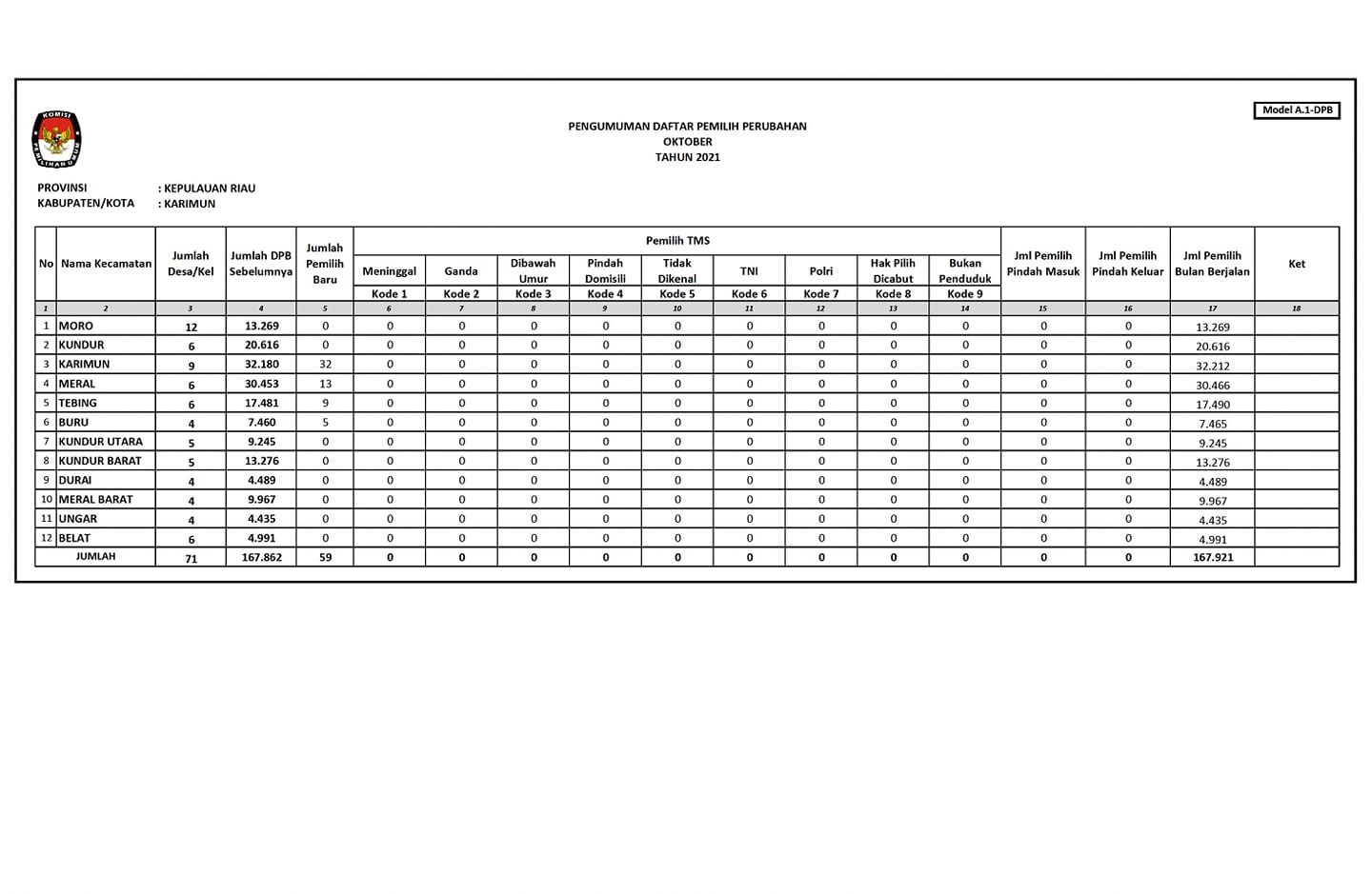 Adapun hasil Pemutakhiran Data Pemilih Berkelanjutan (PDPB) pada Bulan Oktober Tahun 2021 di Kabupaten Karimun adalah berjumlah seratus enam puluh tujuh ribu sembilan ratus dua puluh satu (167.921) pemilih yang terdiri dari delapan puluh lima ribu dua puluh lima (85.025) pemilih laki-laki dan delapan puluh dua ribu delapan ratus sembilan puluh enam (82.896) pemilih perempuan yang tersebar di tujuh puluh satu (71) Desa/Kelurahan dan dua belas (12) Kecamatan.