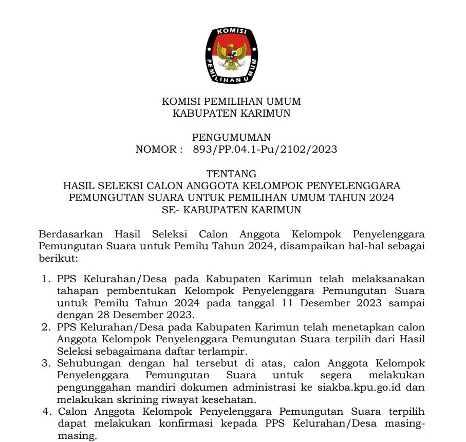 PENGUMUMAN HASIL SELEKSI CALON ANGGOTA KELOMPOK PENYELENGGARA PEMUNGUTAN SUARA UNTUK PEMILIHAN UMUM TAHUN 2024 SE- KABUPATEN KARIMUN