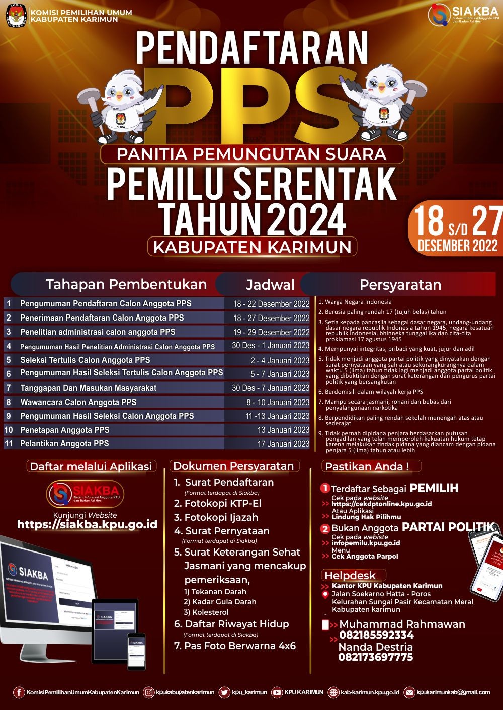 Dalam rangka pembentukan Panitia Pemungutan Suara untuk Pemilihan Umum Tahun 2024, Komisi Pemilihan Umum Kabupaten Karimun mengundang Warga Negara Indonesia yang memenuhi persyaratan untuk mendaftarkan diri menjadi anggota Panitia Pemungutan Suara untuk Pemilihan Umum Tahun 2024 dengan ketentuan sebagai berikut: