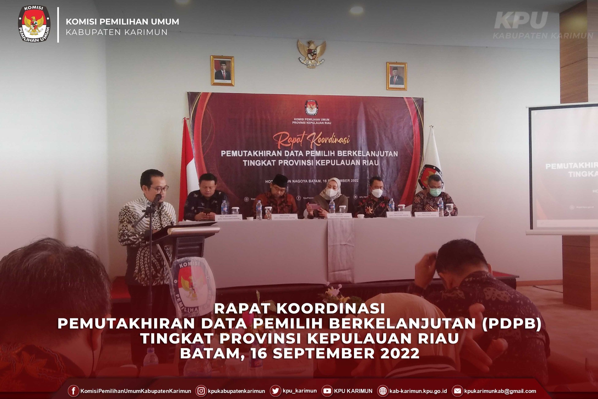 KPU KABUPATEN KARIMUN : Anggota KPU kabupaten Karimun Divisi Perencanaan, Data dan Informasi Bapak Ir. Mardanus, Kasubbag Perencaaan Data dan Informasi Vivi Anasari dan Operator Sidalih Andika Irwan Mengikuti Rapat Koordinasi Pemutakhiran Data Pemilih Berkelanjutan Tingkat Provinsi Kepulauan Riau yang berlangsung di Kota Batam. Kegiatan dibuka oleh Ketua KPU Provinsi Kepulauan Riau Sriwati. Dalam sambutannya, Ketua KPU Provinsi Kepualaun Riau menghimbau KPU Kabupaten Kota se-Provinsi Kepulauan Riau untuk meningkatkan kualitas Data Pemilih Berkelanjutan agar lebih akurat dan menjaga kerahasiaan dan kemanaan data pemilih terkait isu terpopuler yang sedang terjadi pada saat ini. Turut hadir, Staf Pelaksana Pusdatin KPU RI yang membidangi Aplikasi dan Data Pemilih David Soma, Anggota Bawaslu Provinsi Kepulauan Riau Koordinator Divisi Hukum, Humas dan Data Informasi Indrawan Susilo Prabowoadi sebagai narasumber kegiatan tersebut. Kegiatan ditutup dengan pemaparan hasil Pemutakhiran Data Pemilih Berkelanjutan tingkat Kabupaten/Kota dan tindak lanjut data Tidak Padan oleh masing-masing Anggota KPU Kabupaten/Kota Divisi Perencanaan Data dan Informasi.